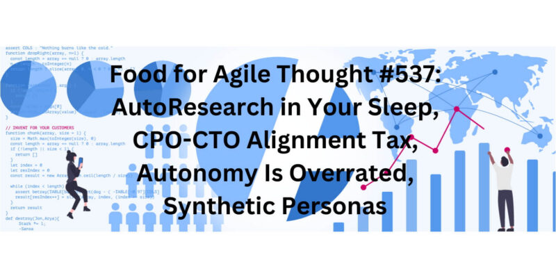Welcome to the 537th edition of the Food for Agile Thought newsletter, shared with 35,652 peers. This week, Andrej Karpathy and Aakash Gupta explore how AI agents are reshaping digital work through autonomous multi-agent workflows and autoresearch loops that run 100 automated improvement cycles overnight. Shifting to team dynamics, Christina Wodtke sees the friction between frontline teams and management as a perspective problem across abstraction levels, while Stephanie Leue warns that polite CPO-CTO misalignment costs far more than the honest conversation both parties avoid. Maarten Dalmijn adds that autonomy without alignment creates silos, not freedom, and Jerry Neumann challenges the entire startup methodology canon, proposing that widely adopted frameworks like Lean Startup become self-defeating the moment everyone uses them.