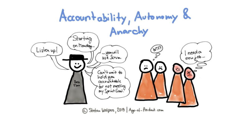 ‘Autonomy without accountability equals anarchy’ summarizes an essential design element of any agile organization. Without these checks and balances in place any aspiration to transform an organization is likely to fail. (Or at best level out at a mechanistic level.) Learn more about how Scrum deals with accountability.