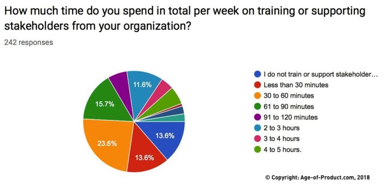 A quarter of all respondents is not coaching stakeholders at all or allocates less than 30 minutes per week to this task. The rest allocates various amounts of time to stakeholder education, most commonly around an hour or two per week.